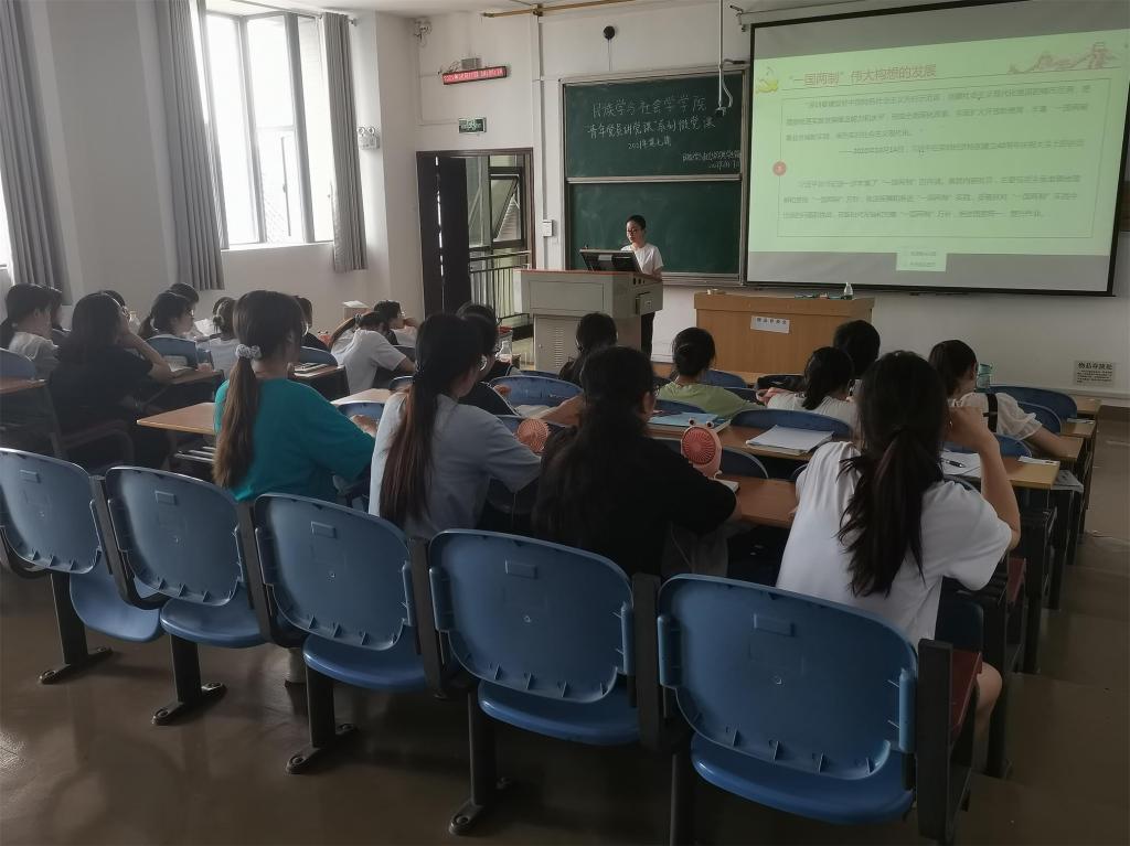 活动伊始,胡瑞洋同志从“一国两制”伟大构想的提出与构想、发展历程、香港澳门回归和当代影响四方面阐述“一国两制”国策。在讲解PPT的过程中,她以港澳回归的视频形式带领在座同志重温往日辉煌,彰显“一国两制”伟大功绩。随后,她结合历任国家主席为“一国两制”发展作出的贡献阐述该政策愈发完善健全,重点讲述其对海峡两岸关系友好发展、密切交流的现实意义。