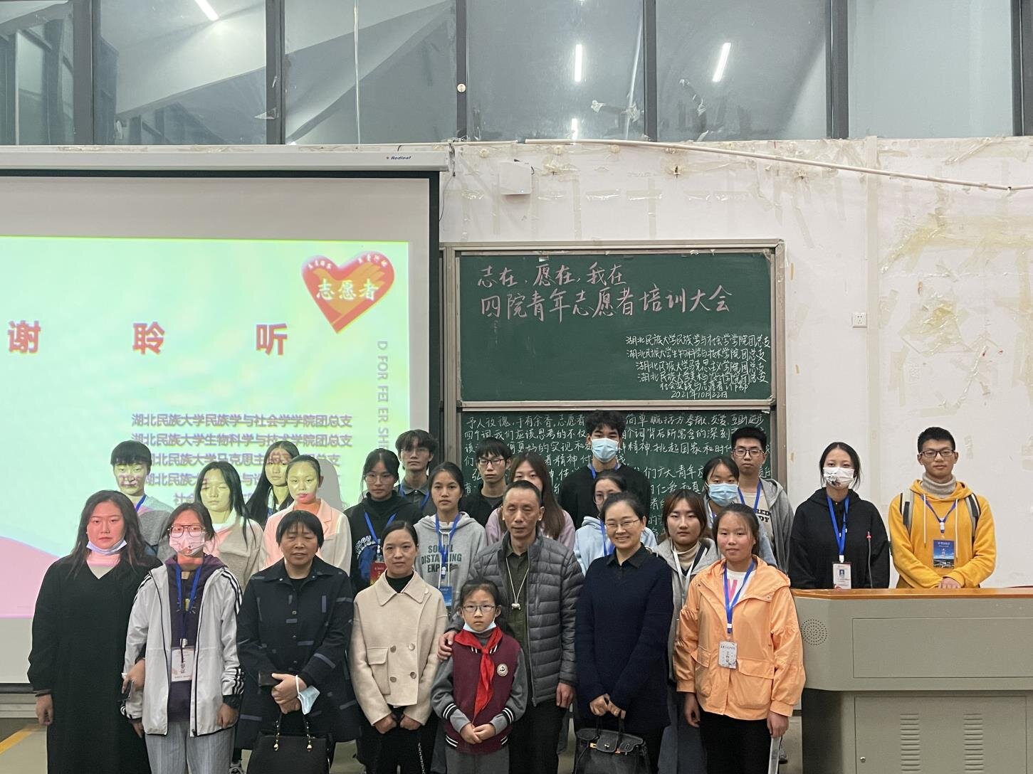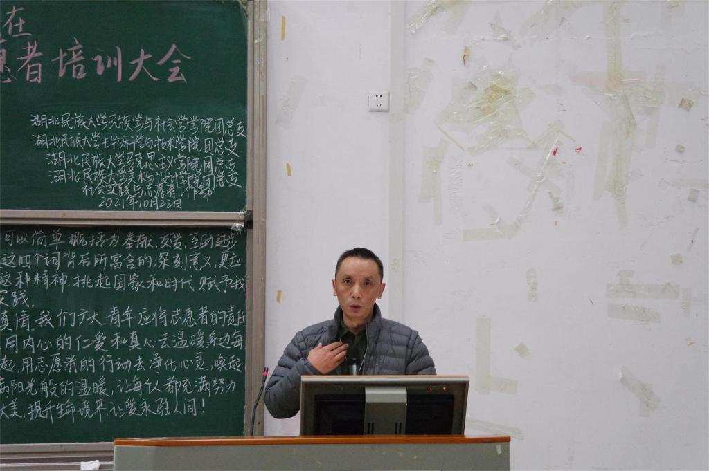 本网讯(记者 欧阳洁 刘雨/文 陈文宇 刘睿/图)为增强青年志愿者对志愿者服务活动意义的理解,加强各二级学院交流,10月22日,我院团总支社会实践与志愿者工作部联合生物科学与技术学院、马克思主义学院、美术与设计学院在修远楼5B404教室举办青年志愿者培训大会,恩施义工协会会长谭鸿担任主讲人,恩施州心理咨询师谭金钊、杨娟、张富琼受邀出席本次活动各兄弟社团及四院大一年级青年志愿者参与聆听。