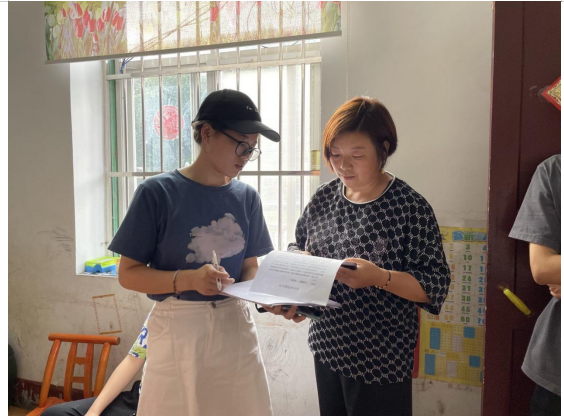 此次调研活动主要在校场坝村村委会附近开展,团队采用“访谈+问卷”的形式,对校场坝村家中有学生的家庭展开调研。调研伊始,在村委代表的带领下迅速分配任务并分头行动。调研内容主要了解服务对象参与活动的意愿并与家属签署安全责任书,随后针对家长与孩子的家庭关系情况进行问卷调查。