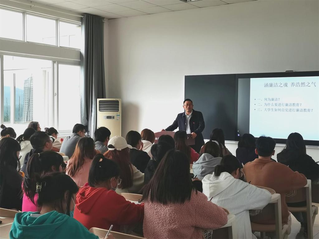 本网讯(记者 周树洋/文 见习记者 董金科/图)10月28日,我院在德智楼9B405-2教室举办以“涵廉洁之魂,养浩然正气”为主题的廉政专题党课培训活动,我院党总支书记曹召胜担任本次党课培训主讲老师。外国语学院、教师教育学院及我院发展对象、入党积极分子参与学习。