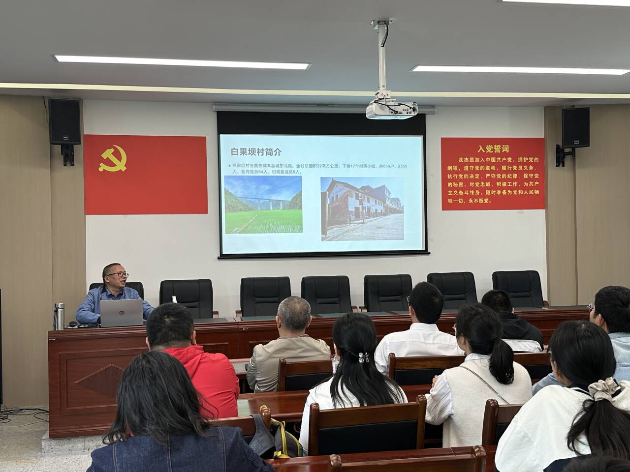 全体党员在党总支书记曹召胜同志的组织下重温了入党誓词,随后开展了集中学习、民主议事等环节,还邀请了白果坝村村委会周主任为师生党员介绍白果坝村的相关情况。