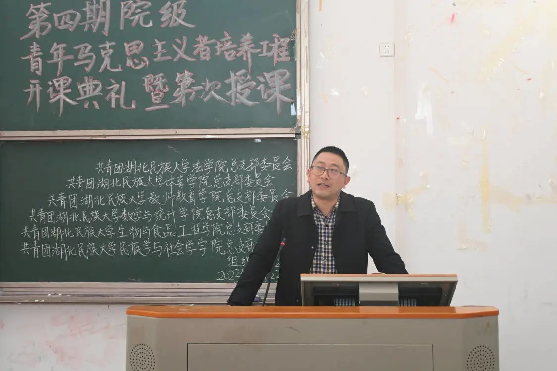 本网讯(记者 田露妍(见习)/文) 11月23日,我院法学院、体育学院教师教育学院、数学与统计学院、生物与食品工程学院六院共同举办的第四期“青年马克思主义者培养工程”培训班开课典礼暨第一次授课在修远楼5B404教室举行。我院党总支书记曹召胜法学院团总支书记谢学婧、教师教育学院团总支书记李志刚、生物与食品工程学院团总支书记张鑫媛、体育学院团总支书记黄昱勍受邀出席本次活动。