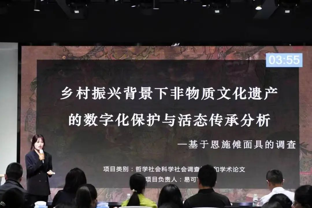 易可可、刘文燕、王钰鑫、石佳欣等同学聚焦于恩施傩文化,通过扎实的调查,形成了“多村振兴背景下非物质文化遗产的数字文化保护与活态传承分析--基于恩施傩面具的调查”项目,恩施傩面,那一张张神秘的面容背后,是岁月沉淀的文化密码。团队成员们多次深入恩施村落,拜访老艺人,在昏暗的老屋里,在布满尘埃的道具间,探寻傩面具的制作工艺、背后传说与仪式内涵。他们运用现代数字技术,扫描建模、数据留存,让古老傩面具跨越时空,在数字世界中重焕生机,本项目在“挑战杯”上收获了一等奖的佳绩。