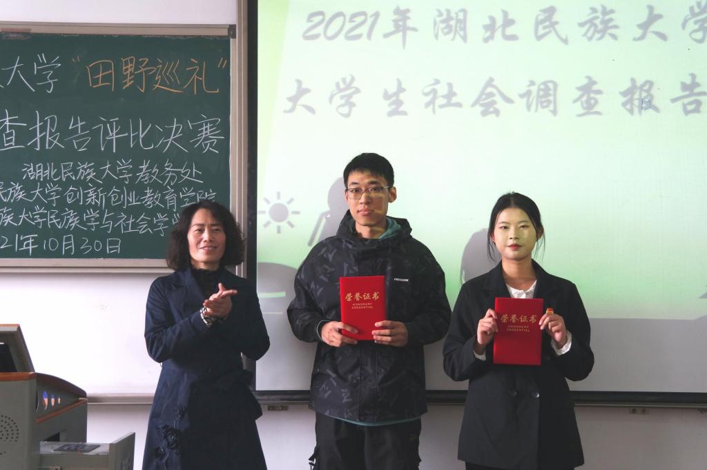 本次比赛共有11个项目进行角逐,比赛通过PPT展示及现场答辩形式对参赛项目的社会调查报告进行评比。各个项目调查报告基本从调查背景、调查方法、调查结果等几方面进行介绍。其中,4号项目《疫后恩施旅游业荆棘与重生》中调查恩施州内相关景点在疫情后经济收入情况,以充足的数据支撑并多角度地分析其旅游经济下降的原因,其调查报告表明旅游业曙光在前,回暖希望大并对恩施旅游业提出相关建议。11号项目《恩施州老年群体被骗现状调查研究》中,项目负责人就团队取得的成效进行具体分析,他们将老年群体从一般大众群体中分离出来进行针对性研究,得出老年群体受骗是多因素派生的结果并根据社会现状提出专业性及科学性及可行性建议。最终,4号项目和11号项目荣获一等奖。