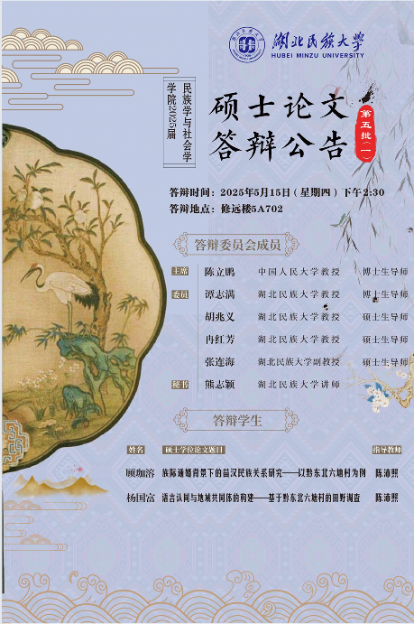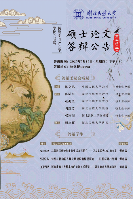 民族学与社会学学院2025届硕士学位论文答辩公告(5月15日)