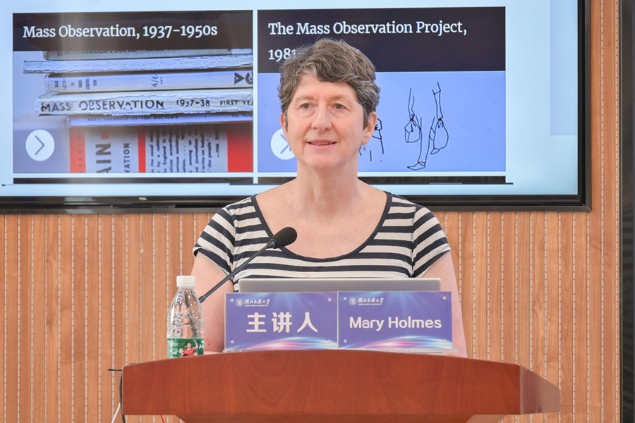 4月12日,Mary Holmes教授围绕“Doing Research: Emotional imaginaries”这一核心议题,通过具体案例展开深度分享。她首先阐述情感研究的方法选择,既列举了问卷调查、民族志、文本分析等社会学常用方法,又以“英国百年情感变化”为切入点,重点介绍通过观察档案的方式,查找普通人对战争、灾难、疫情等事件的开放式情感印记描述。她指出在不同事件中,人们会依赖电影、歌曲等文化符号赋予情感以具体意义,形成跨时空的情感共鸣。随后,Mary Holmes教授从性别化叙事和对主导叙事的抵制案例入手,谈及文化符号在情感与社会互动中的中介作用,认为情感想象不仅是个体认知工具,更是社会共享的情感语法,连接私人体验与公共意义。