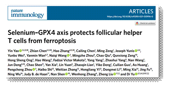 经过多年联合攻关,我校在硒元素研究取得重大进展。2021年8月20日,民大医院“硒-免疫平衡与健康”研究团队的最新学术成果“Selenium-GPX4 axis protects follicular helper T cells from ferroptosis”(硒-硒蛋白GPX4功能轴保护滤泡辅助性 T细胞免于铁死亡)在国际顶级免疫学期刊Nature Immunology(自然杂志子刊,影响因子:25.606)在线发表。该研究创新性阐明了硒蛋白GPX4特异性调控滤泡辅助性 T(TFH)细胞稳态的新机制,并首次证实补硒可通过上调T细胞内GPX4水平促进TFH细胞功能,显著提高健康人群接种疫苗后的抗体分泌水平。
