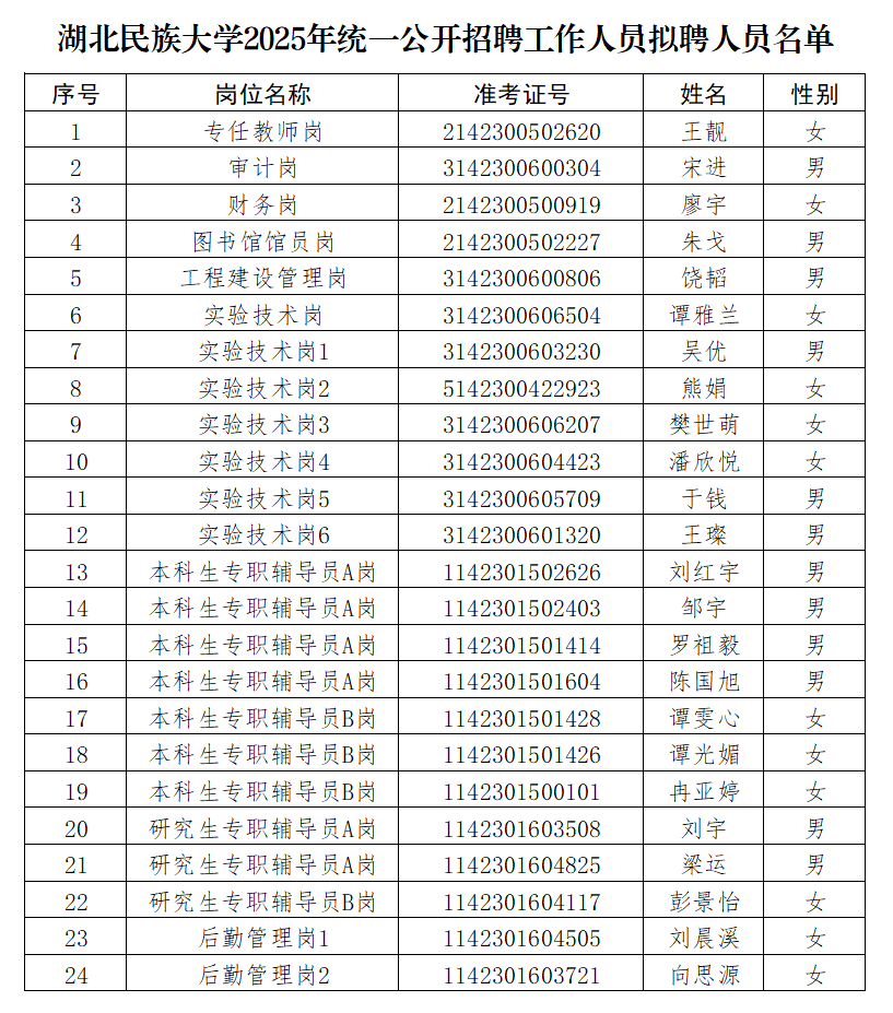 根据《事业单位公开招聘人员暂行规定》(人事部令第6号)等文件规定以及《湖北省省直事业单位2025年统一公开招聘工作人员公告》的有关要求,经笔试、面试、体检、考察等环节,现将拟聘人员公示如下: