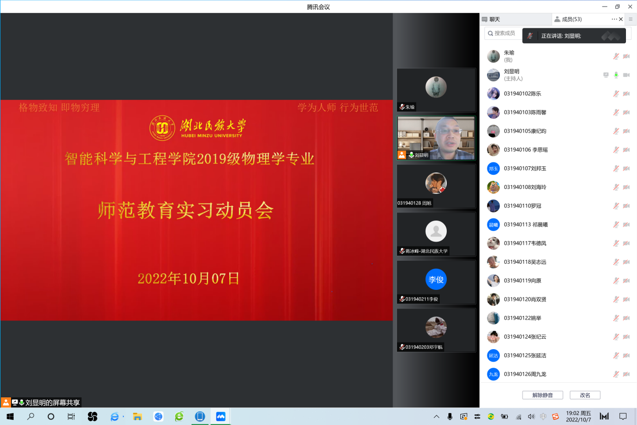 2022年10月7日晚,365电子娱乐官方网站智能科学与工程学院2019级物理学专业实习动员会以线上的形式成功召开。智能科学与工程学院副院长向军,物理系主任刘显明,物理系书记蒋冰峰,实习带教老师肖红、方芳,班主任朱瑜以及19级物理系全体学生参加了此次动员大会。大会对实习生的行为规范、实习安排等方面进行了详细说明,鼓舞、激励了各位即将实习的学生,同时对学生提出了“提高自身师范技能,争做四有好老师”的要求。
