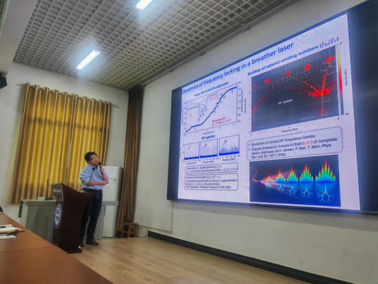 彭俊松研究员首先以大自然相关现象引入主题,介绍了超短激光脉冲的发展历程及相关应用。随后,结合研究团队最新研究成果,介绍了呼吸子激光产生的非线性动力学过程及与其相关的其它物理现象,如魔鬼阶梯、分形、拓扑、量子扩散/行走、奇点等。同时,从光纤设计、非线性控制、智能算法、电路设计等方面介绍了如何实现光纤激光器的AI控制。