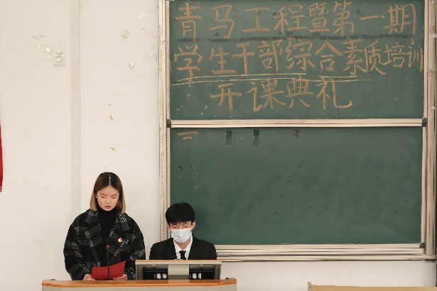 典礼开始全体起立奏唱团歌,郑扬帆老师简单介绍了青马工程的背景。随后魏君亦同学宣读管理办法:要求同学们佩戴团徽,请假细则等相关纪律要求。接着由团总支书记郑扬帆宣读培养章程,教导同学们加强理论学习提高思想水平,并讲解了青马工程培养的最终评制办法。之后由本期新生学员代表董梦凡同学发言,她从学生和青年两个方面阐明了自己对本次青马工程的理解,希望能和大家一起不断提高道德文化修养和社会主义精神。典礼最后,汪涛副书记致辞,他提出大家要坚定信念,积极投入到社会主义积极化建设,并宣布我院青年马克思主义者培养工程正式开课。