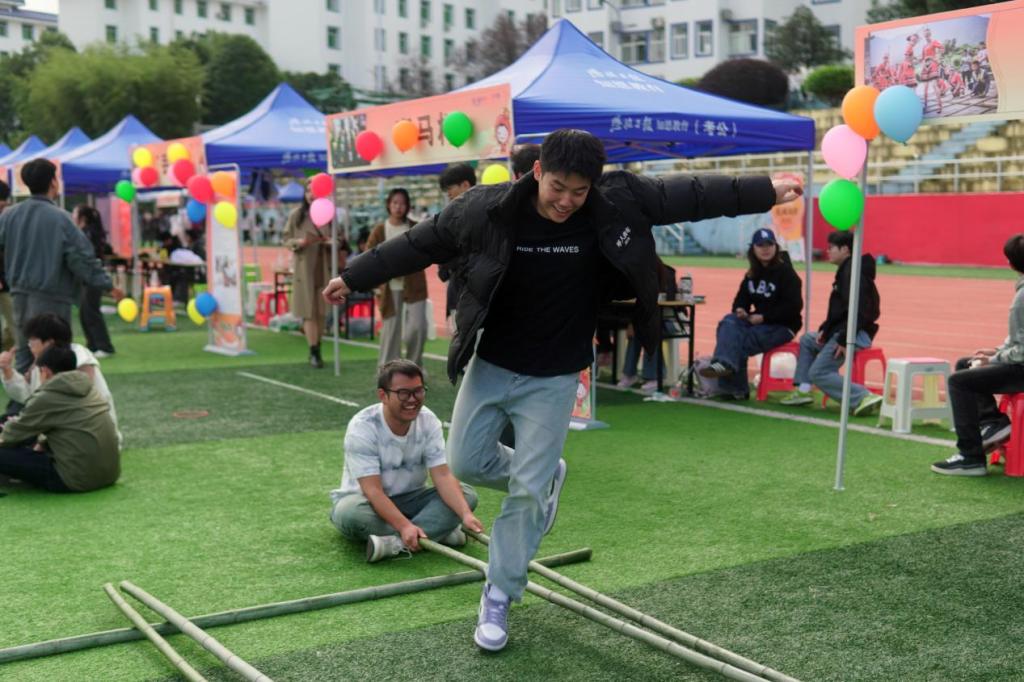 最后,“踏节而跃·壮乡欢舞”将活动推向高潮。该项目源于广西壮族“三月三”的竹竿舞,12~20人分持竿、跳竿两组。8人持4竿呈“田”字,按“开合、开合、开开合”节拍摆竿,4~10人组队跃动,连续完成3组节奏得3分,做“稻穗”手势额外加分,5分钟的限时比拼中,失误可重试。现场竹竿开合声与同学们的欢笑声交织共鸣,既展现了壮乡庆收的欢腾景象,更传递了团结协作的精神内核。