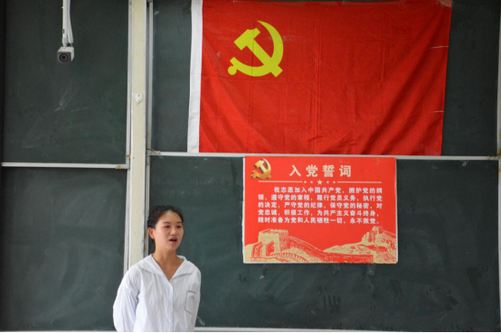 会议伊始,主持人讲述会议两个议程,议程第一项,预备党员起立,宣读入党誓词,宣誓完毕。