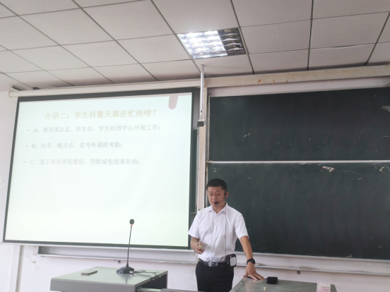 党总支副书记何斌跟大家谈到我院学生工作职能与学生干部应尽的职责和责任,希望大家在大学生活里能够不断提高自身综合能力,做一名优秀的体院学子。随后就大学生职业生涯规划和体育人如何读大学进行了深入浅出的讲解,通过职业生涯规划,能够帮助大家过好大学中的学习与生活。