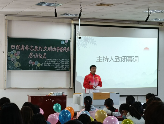 随后我院新生志愿者代表武勇进行发言,他提出青年志愿者是一个平凡而不平庸的称号,它代表的是一种责任、一份坚持、更是一种奉献精神。仪式最后全体志愿者起立并宣读志愿者誓词,主持人陈浩杰宣布文明劝导活动正式开始。