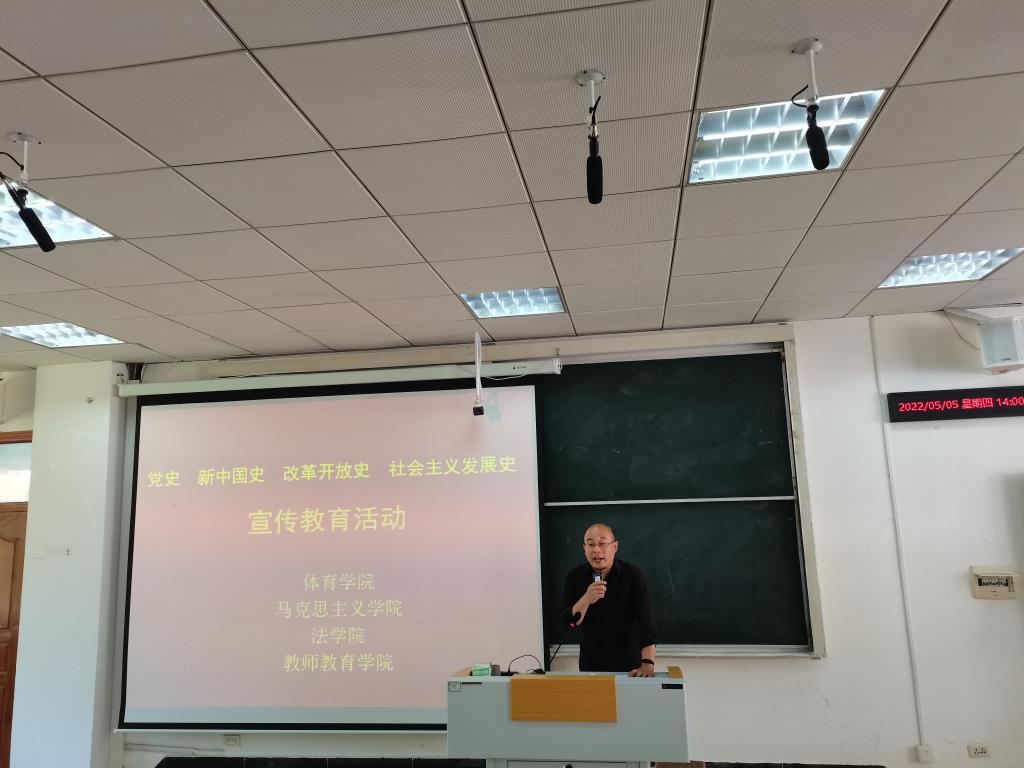 (通讯员 张弋明)5月5日下午,由体育学院、法学院、马克思主义学院、教师教育学院四院联合开展的“四史”学习活动在德智楼9B301举行。体育学院院长倪东业、党总支书记何斌、副院长胡庆华、党总支副书记万利以及体育学院全体教职工参加。活动由法学院党总支副书记许宗友主持。