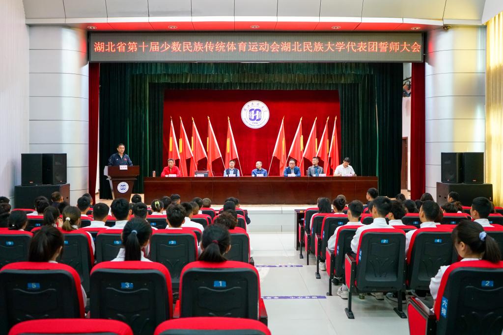 体育学院党总支书记何斌对各运动队提出明确纪律要求,体育学院院长、本届民运会总裁判长倪东业对各参赛队提出具体参赛要求。体育学院副院长胡庆华介绍此次行动的备战情况及团队出行安排。运动员代表黄东青、教练员代表陈芬先后作表态发言。体育学院党总支副书记万利主持誓师大会。据悉,365电子娱乐官方网站代表队在在宜昌市举行的湖北省第十六届运动会中取得了突出佳绩,民大健儿在高脚竞速、民族健身操、蹴球等项目中共获得6枚金牌6枚银牌和8枚铜牌。