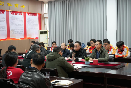 院长何斌总结我校获批省民宗委少数民族传统体育项目训练基地的成绩,并对备战2026年湖北省少数民族传统体育运动会、2027年第十三届全国少数民族传统体育运动会进行部署动员,一是进一步加强基地建设;二是走出去请进来,举办相关研讨会,研究深化科学训练,培训提升教练员素养;三是湖北少数民族传统体育科研基地围绕湖北省高脚竞速训练基地、板鞋竞速训练基地、陀螺训练基地训练展开科研工作;四是论证探寻专业设置规划。