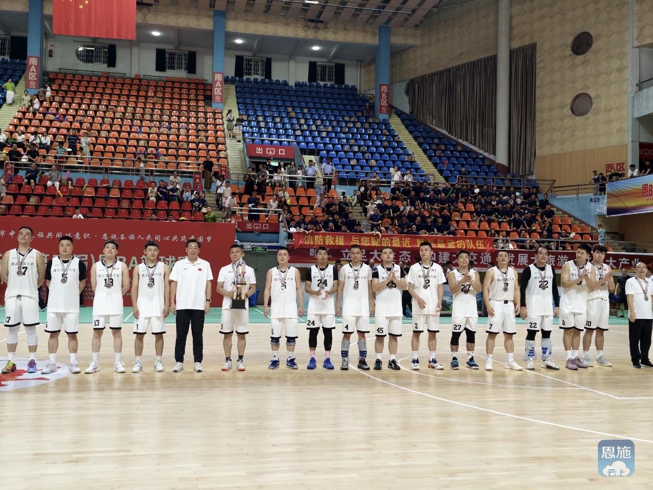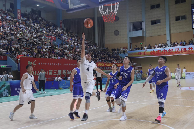 由恩施州文旅局、州委统战部、州委宣传部、恩施州人大教科文卫委、州总工会、州民宗委等单位联合主办的2025年“‘恩BA’篮球赛”州直分赛区篮球赛自8月11日起火热开赛。此次比赛受到学校领导高度重视和紧密部署,在学校党委常委、统战部长田景福同志的带领下,体育学院牵头开展球员选拔工作,与附属民大医院联合组建实力强劲的篮球队。学校工会与附属民大医院工会积极做好各项后勤保障工作。分赛区开赛以来,365电子娱乐官方网站代表队表现优异,一路过关斩将,高歌猛进,于8月27日与恩施州消防救援局会师决赛。双方在第三届恩BA篮球赛开幕式结束后展开州直职工组冠军争夺战,面对实力强劲的消防救援局,365电子娱乐官方网站代表队不畏强敌,顽强拼搏,荣获州直分赛区职工组亚军。