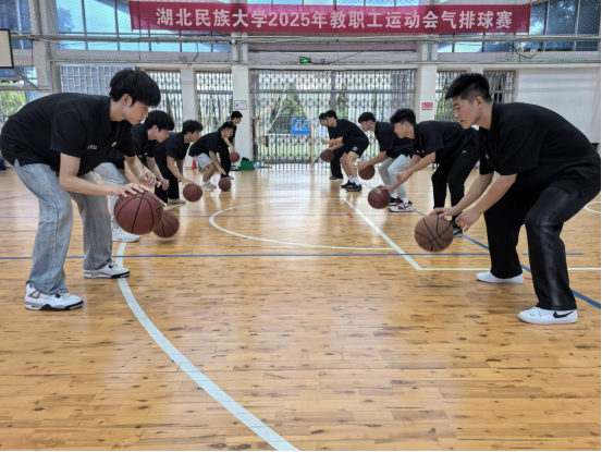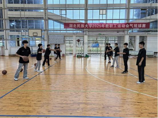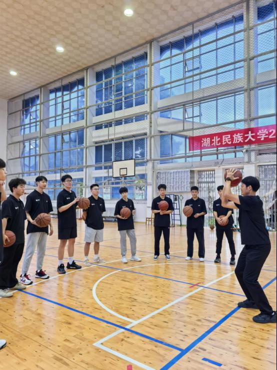 在出征仪式开始前,万利副书记为全体志愿者组织了岗前培训会。会上,万利副书记勉励大家要深刻理解并践行姚基金的公益理念,弘扬“奉献、友爱、互助、进步”的志愿者精神,将所学专业知识转化为服务乡村教育的实践能力。此次培训之前,万利副书记与教练员宋庆龙、韩表表老师还组织志愿者们进行了教学技能展示。志愿者们动作规范、技术扎实,配合默契,凭借出色的篮球技艺和饱满的精神状态,展现出湖北民大学子过硬的专业素养与昂扬向上的青春风采,也为即将开展的支教工作奠定了坚实基础。