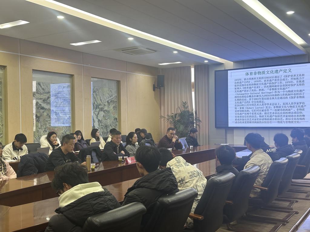 20251210,体育学院于德智楼A栋三楼会议室举办题为“体育非物质文化遗产研究中的科研方法运用”的学术讲座。本次讲座邀请中央民族大学的韦晓康教授作为主讲嘉宾,会议由体育学院副院长胡庆华主持,学院师生参加会议