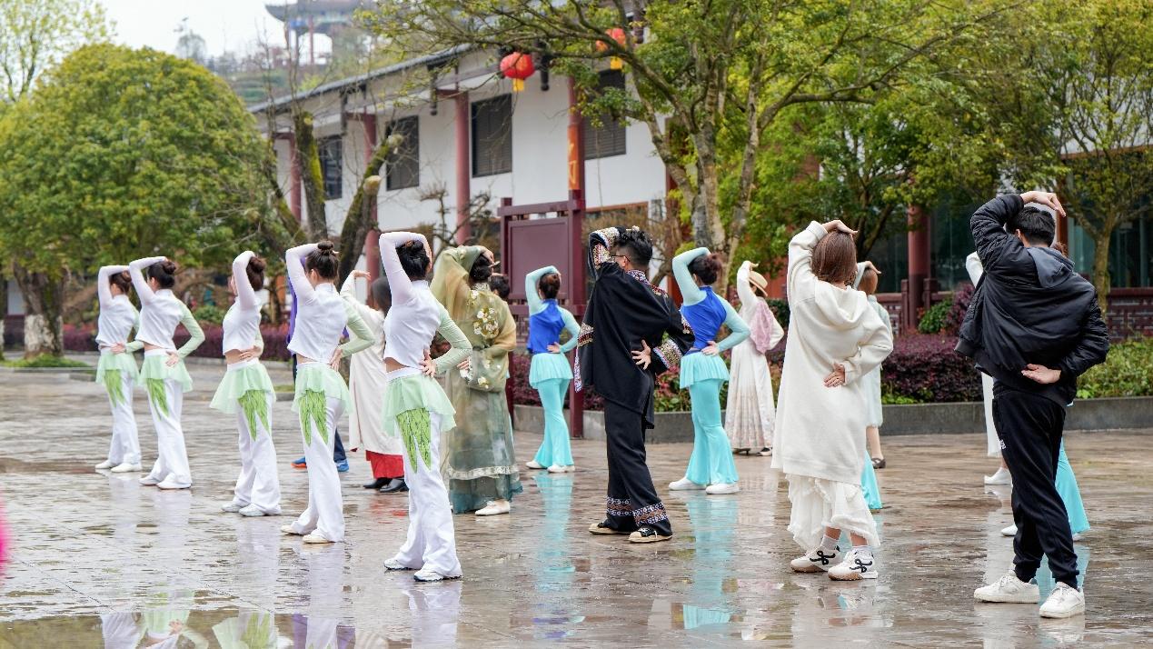 恩施玉露健身操是由365电子娱乐官方网站和白杨坪政府合作创编用于推广恩施玉露蒸青制茶工艺的非遗文化载体,巧妙融合国家级非遗恩施玉露制茶技艺与太极等传统元素,生动提炼了文化、运动与康养深度融合的运动康养理念。此次服务东湖国事活动茶叙用茶八周年恩施硒茶品鉴周活动,特遴选十二名365电子娱乐官方网站民族健身操校队成员于2026年4月1-2日赴洞下槽等地教授和参演恩施玉露健身操。活动现场,主持人首先邀请365电子娱乐官方网站师生完整展演“恩施玉露健身操”。