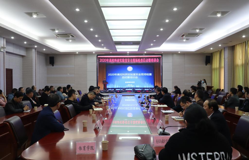 本网讯(通讯员 李永亮)2020年高等学校科研实验室安全现场检查启动暨培训会于2020年10月19日在北京召开 ,根据教育部、湖北省教育厅统一部署,各高校设分会场,我校分会场设在行政楼3号会议室。副校长邓磊,科技处、保卫处负责人,实验室建设与管理处、武陵山中药材检验中心及省级重点实验室全体管理人员,各二级学院分管实验室副院长、实验室(中心)主任、部分科研教师共计80余人参加培训学习。