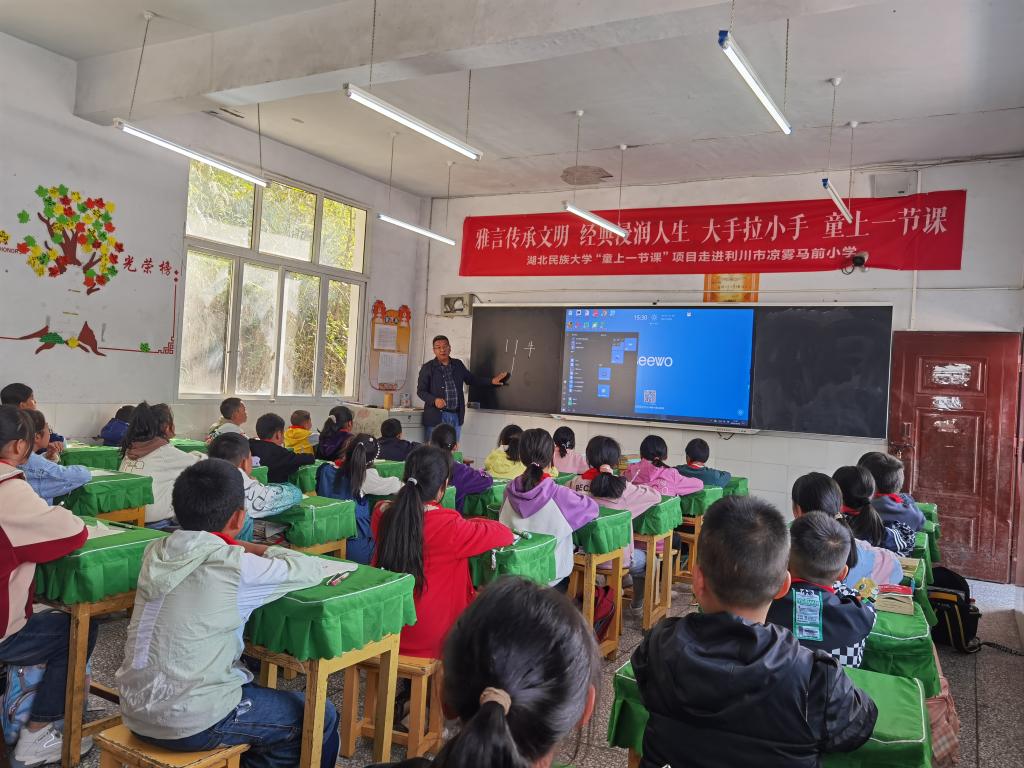 民进易文风老师为马前留守儿童讲授了书法展示课。他首先介绍了汉字基本笔画书写过程,主要包含顿笔、行笔及收笔等的方法介绍,然后讲述了笔画与笔画组合的基本规律,如平行等距,避让和呼应等。最后说明了汉字结构的基本知识。在展示课结束时,易老师还鼓励同学们多观察,多思考,勤动手,力争写好汉字,培养情操,逐渐形成良好的艺术品质。
