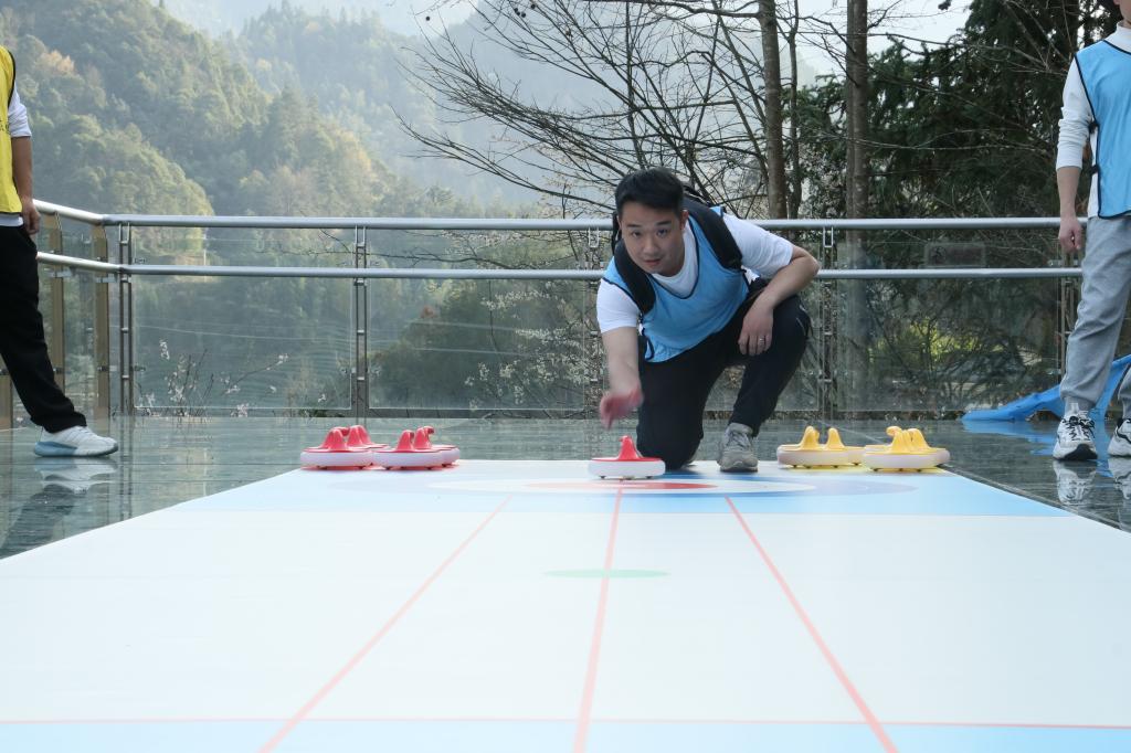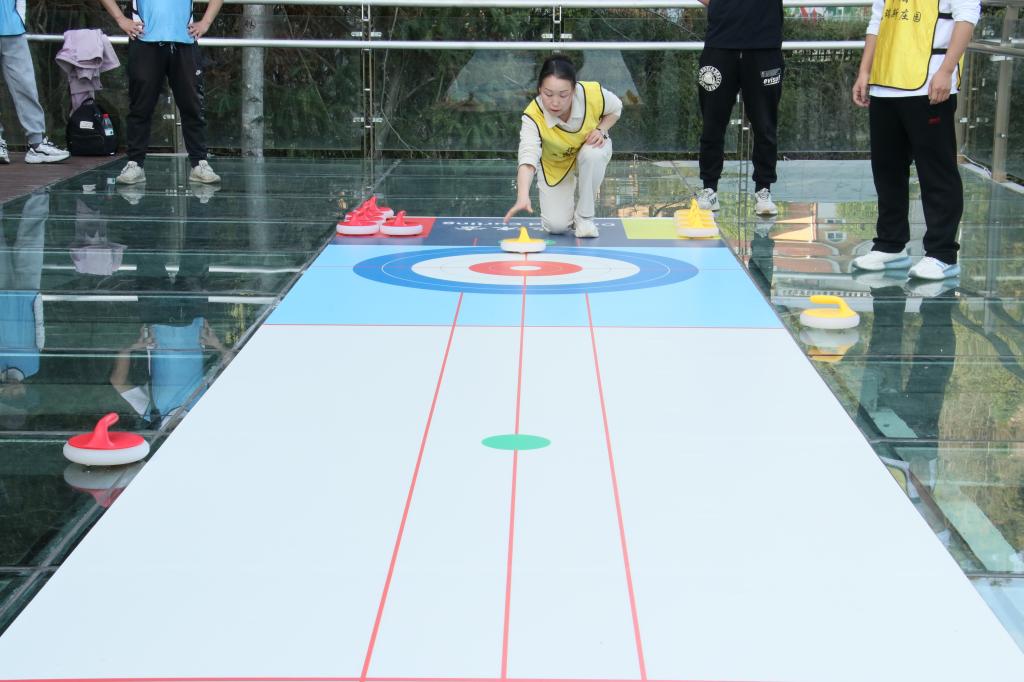 “旱地冰壶”竞技中,队员们全心地投入和认真的态度,赛出了风采,展现了英姿,掀起了阵阵高潮。