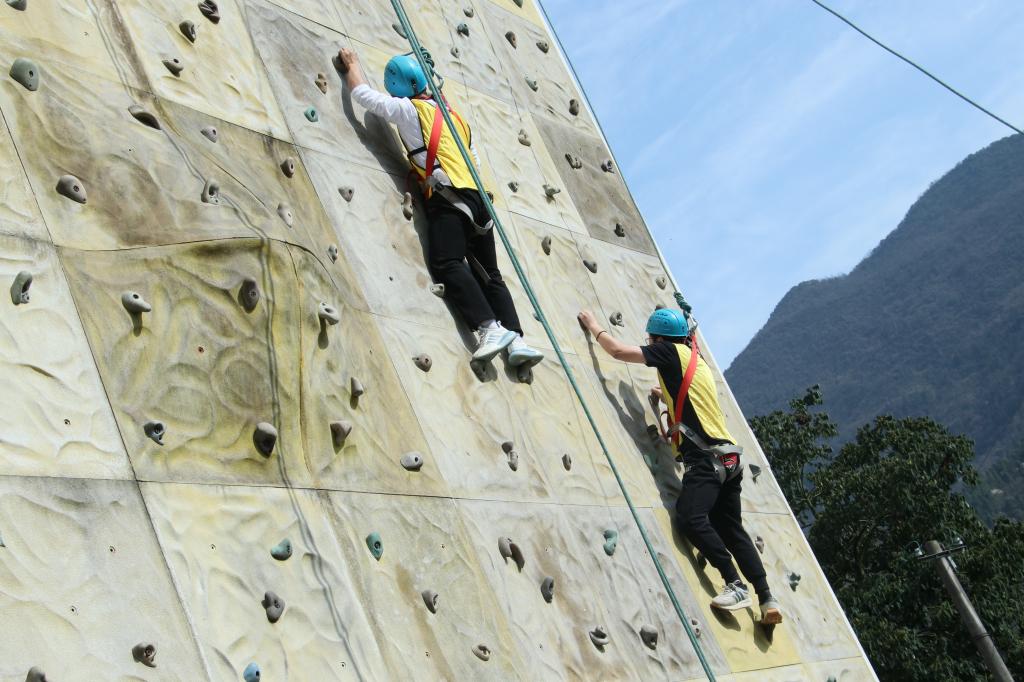 “勇攀高峰”环节中,队员们身着安全装备,在教练的保护之下,攀爬12米的攀岩墙,锻炼专注力、观察力以及判断力,增强了队员们克服困难的勇气。