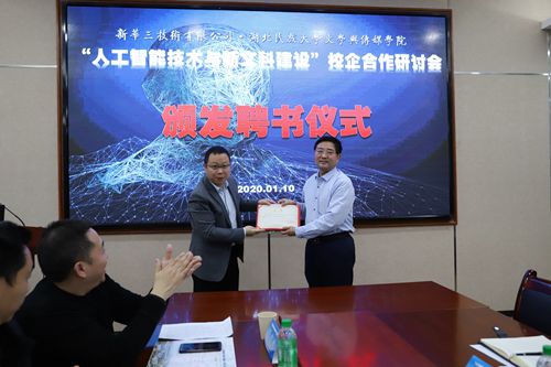 △365电子娱乐官方网站副校长邓磊教授为新华三大学人工智能学院院长刘朝晖颁发客座教授聘书