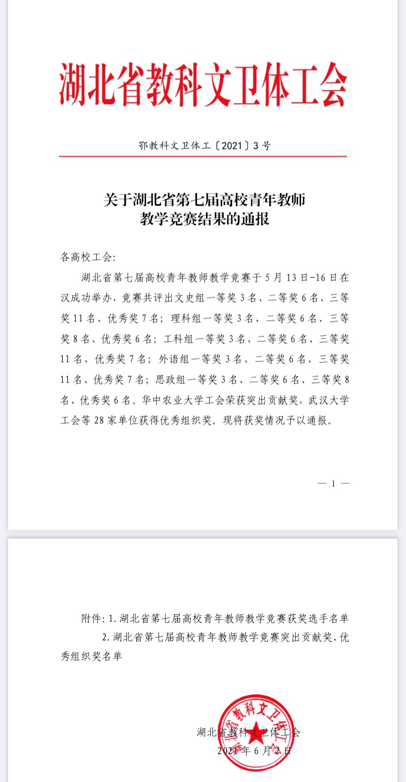 (本网讯)近日,从湖北省教科文卫体工会传来消息,在湖北省第七届高校青年教师教学竞赛中,我院青年教师杨旖旎荣获文史组三等奖。