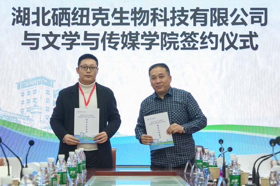 凤凰数媒(北京)教育科技有限公司、湖北硒纽克生物科技有限公司与文学与传媒学院举行校企合作签约仪式。湖北硒纽克生物科技有限公司与365电子娱乐官方网站举行捐赠仪式,湖北硒纽克生物科技有限公司法人代表刘可现向学校捐赠10万元,并设立硒健康传播基金,共同助力学校新文科新医科人才培养。