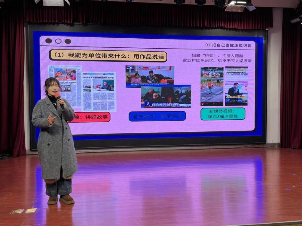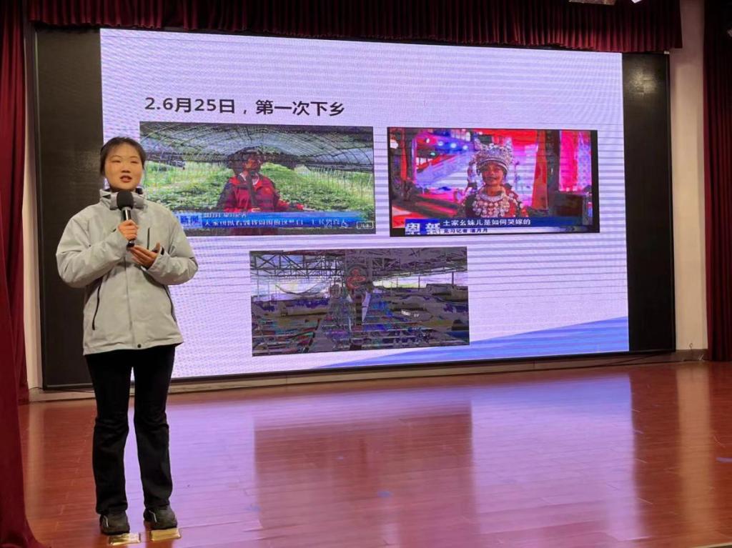 2020级新闻学专业夏璐以自身在鹤峰县融媒体中心的实习经历,向同学们分享了自己从“没有拿得出手的作品”到“拍的作品被数家央媒转载”的实践过程和心路历程。最后夏露建议同学们要在工作中保持礼貌,主动寻找工作机会;克服社恐心理,抓住学习机会,积极与带教老师交流沟通;学会日常复盘,勤反思勤汇报;保持良好的心态。