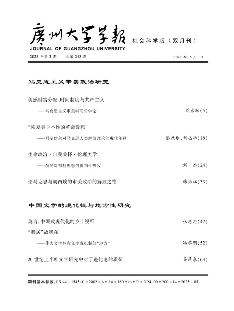 2025年第3广州大学学报发表我院特聘教授冯黎明的文章:《我居”故我在——作为文学性意义生成机制的“地方”》。