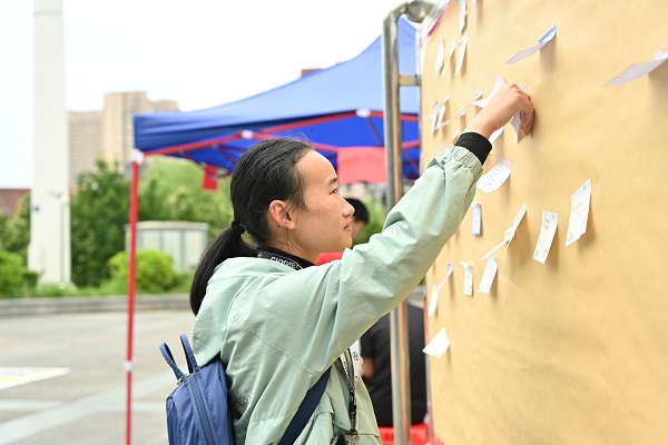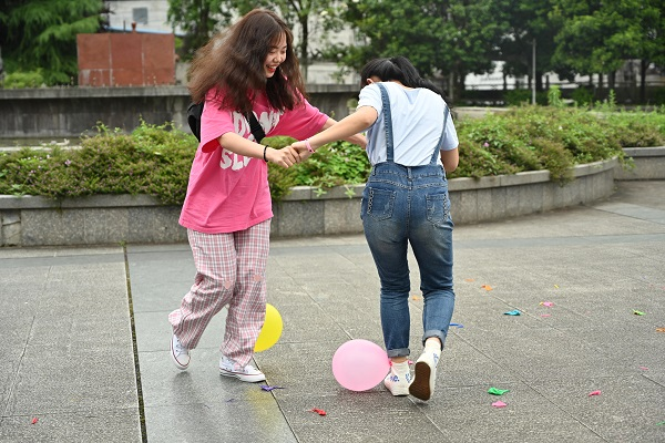 “踩气球大作战”环节,参与者两两一组,绑上气球进行比拼,充分考验参与者身体协调和反应能力,各组团结协作,互相配合,现场一片欢声笑语,吸引众多学生驻足喝彩观看;“心心寄语”环节,参与者在色彩绚丽的便利贴上为自己喜欢或感激的人写下“三行情书”,并粘贴在展板上,一字一句传递真情,用最美的文字表达深情的爱,寄托美好祝福。