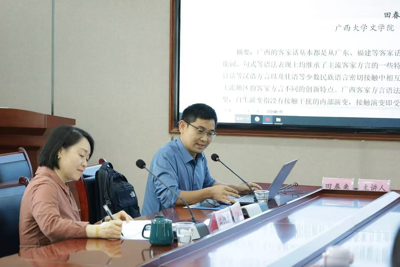 本网讯(通讯员 文瑞婷 陈云豪)10月18日上午,文学与传媒学院荣幸地迎来了广西大学文学院副院长、杰出校友田春来教授。在智慧教室一,田教授为师生们呈现了一场题为“广西客家方言语法特征的承袭与创新”的精彩学术讲座。田教授首先强调了广西客家方言作为中华民族语言文化宝库中的瑰宝,它不仅承...