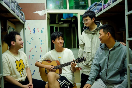 3月31日,正值周末,博学7栋301宿舍的窗户从夜幕中透出一束温暖的灯光,伴随灯光的方向传来一阵欢笑声,张宏达同学正在寝室弹奏着吉他,室友们打着节拍一起合唱。301宿舍的四位同学分别是维吾尔族、蒙古族和土家族,其中既有本校学生,也有来自武汉科技大学的委培学生,大家在学习上相互帮助、互相促进,在生活上团结友好、包容友爱,这个其乐融融的小家正是学校大家庭各族学生互嵌交融的真实写照。学校对同专业同年级的学生实行混合编班、混合寝居,全校6121名少数民族学生一共被编入600余个班级,分布在35个楼栋的3000余间寝室,以此建立各族学生相互嵌入式的班级环境和寝居结构,打破学生容易按照民族身份、地域同乡“扎堆”、“抱团”的习惯和传统,创造了开放、多元、包容的学习生活环境。