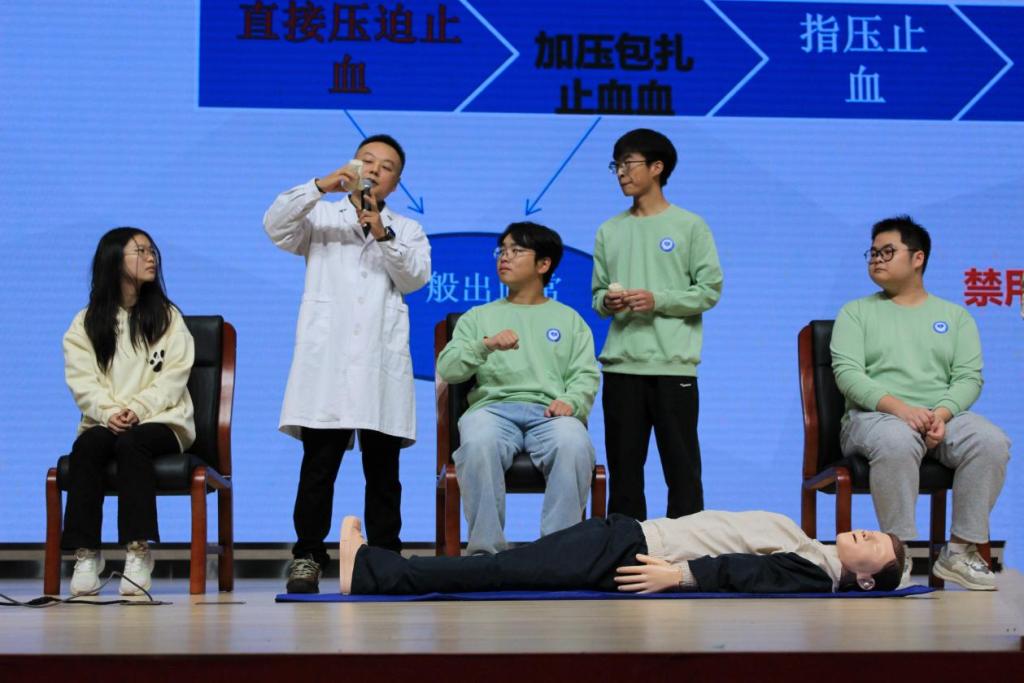 随后,张先锋围绕徒手心肺复苏、止血包扎、烧烫伤处理、气道异物梗阻四大板块开展培训。他以“有人晕倒该怎么办”切入,拆解心肺复苏的按压手法、点位、深度等关键步骤,现场引导师生、宿管上台实操练习;针对不同类型外出血,直观演示止血包扎技巧,强调骨折伤口包扎的固定要点;明确烧烫伤“冲、脱、泡、盖、送”五步骤,并通过动画短片演示海姆立克他救与自救手法。