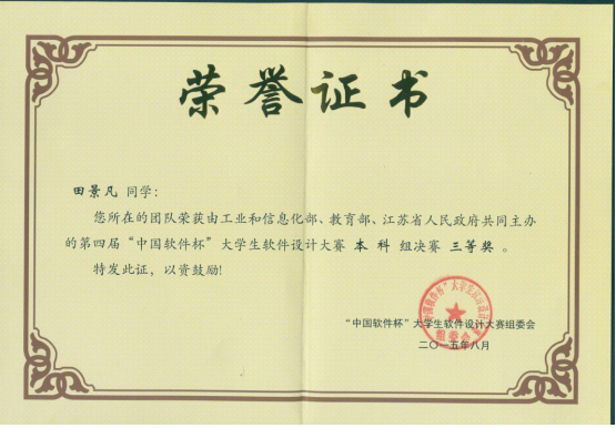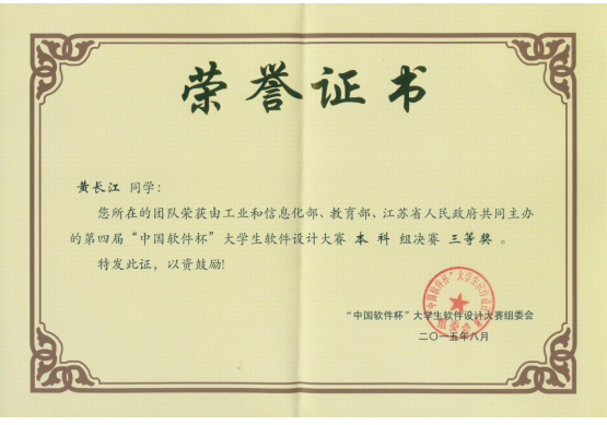 在2012年信息工程学院计算机科学与技术专业部分学生参加第一届中国“软件杯”大赛,2013年组织参加了第二届中国软件杯,并获得了全国二等奖的成绩。在总结前两届比赛结果的基础上,通过总结上次比赛经验的不足,认真做好各项赛前工作,并于2015年4月份组织部分指导教师及学生参加了第四届中国“软件杯”大学生软件设计大赛。本次比赛信息技术创新中心经过两个多月的认真准备、选拔、培训及指导,最终在6月30日前成功提交5件作品。经过参赛师生的共同努力,在总结上次比赛失败教训的基础上,在全国500多所高等院校2000多件件参赛作品当中,我校最终有1件作品成功入围现场决赛。8月17-20日在南京航空航天大学举行的第四届中国“软件杯”大赛现场决赛中,经过现场展示、综合评审与答辩评审三个环节,我校参赛选手杜周成林、田景凡、黄长江等3名同学的作品“比特能机器人”得到了全场评委专家的一致好评,最终荣获了全国三等奖。其他三支参赛队的作品在现场表现也不错,获得了“优胜奖”等奖项。