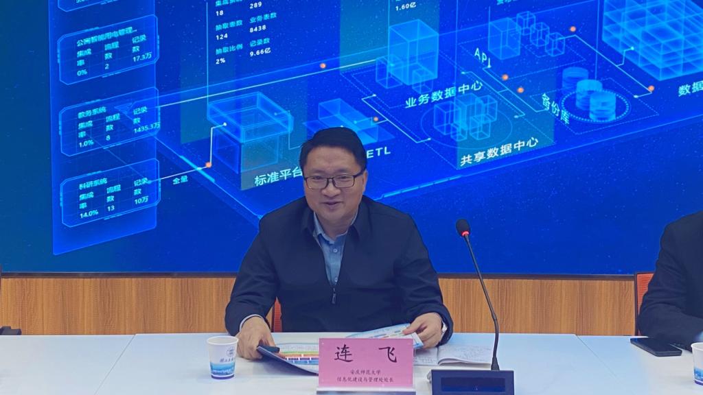中心主任韩阳对连处长的到访表示欢迎。韩主任简要回顾了我校信息化发展历程,详细介绍了学校“1354”信息化建设架构、数据治理与一网通办“2631”工程,重点分享了数据治理与服务治理“六清单两目录”。