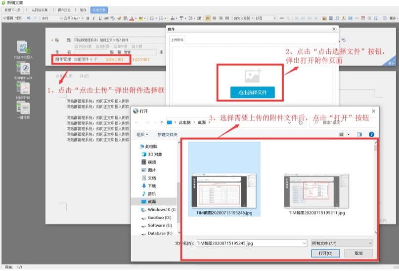 第一步:1、点击“点击上传”弹出附件选择框;2、点击“点击选择文件”按钮,弹出打开附件页面;3、选择需要上传的附件文件后,点击“打开”按钮。