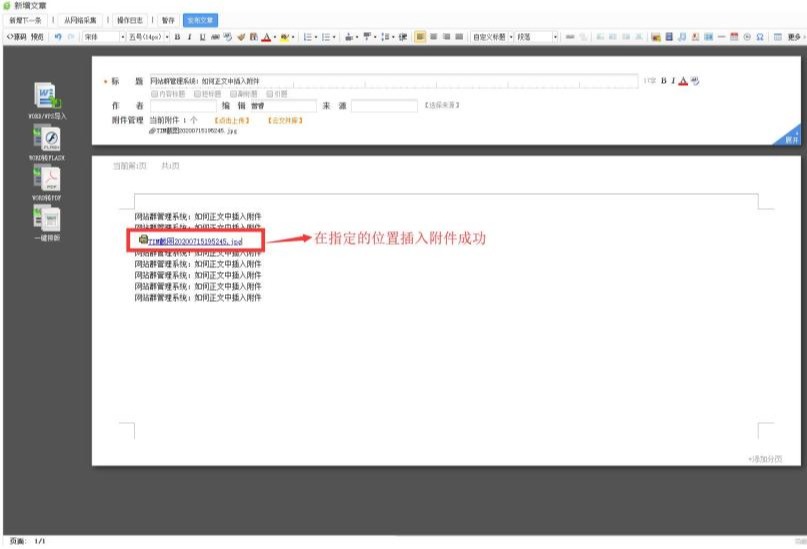 第三步:1、将光标移动到需要插入附件的正文位置;2、将鼠标移动到附件名,在附件名后会显示“插入正文”按钮,点击“插入正文”按钮即可在光标位置插入附件。