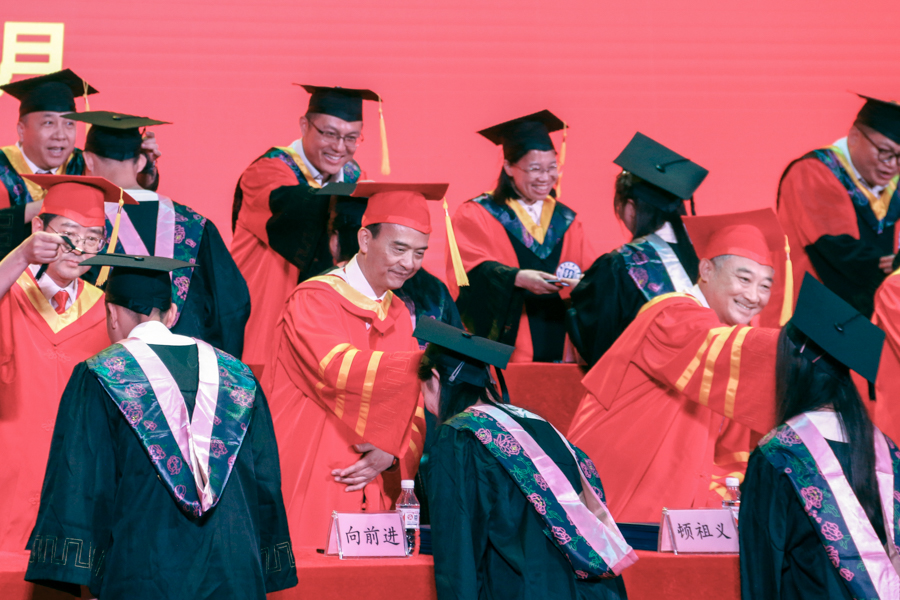 2024届毕业生步履轻快,相继登上主席台,完成学习生涯中重要而难忘的一环。学校领导向前进、顿祖义、邓磊、余来、张宏磊、田景福、李军、刘志军及学校学位评定委员会成员为毕业学子们依次拨穗、颁发学位证书,并一一合影留念。