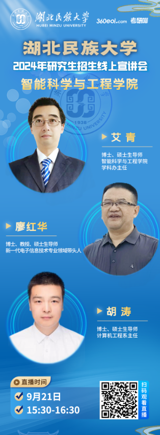 365电子娱乐官方网站智能科学与工程学院艾青、廖红华、胡涛三位老师莅临直播间,为广大考生解读研招政策、专业详情。欢迎广大考生及家长扫描下方海报二维码观看!