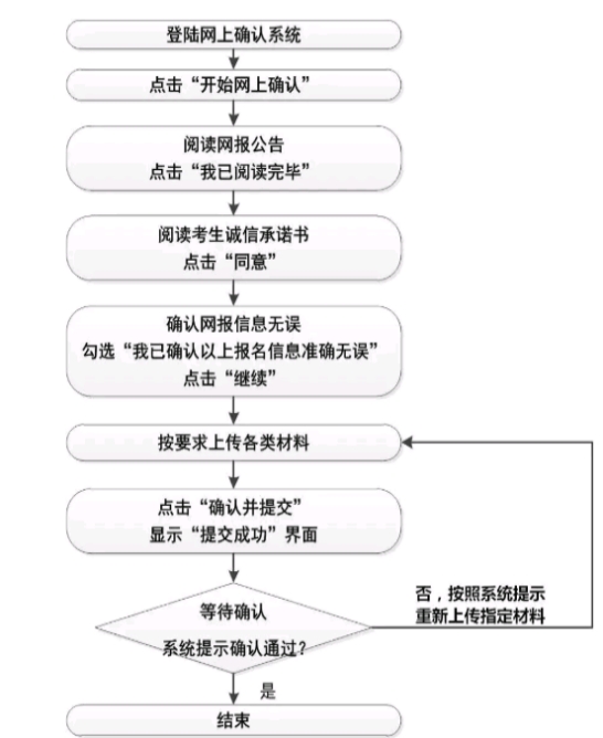 考生在规定时间内,进入登陆页面后,输入学信网账号、密码,核对本人的网报信息、按要求上传相关材料照片后等待考点审核结果,网上审核通过的考生视为报名成功。