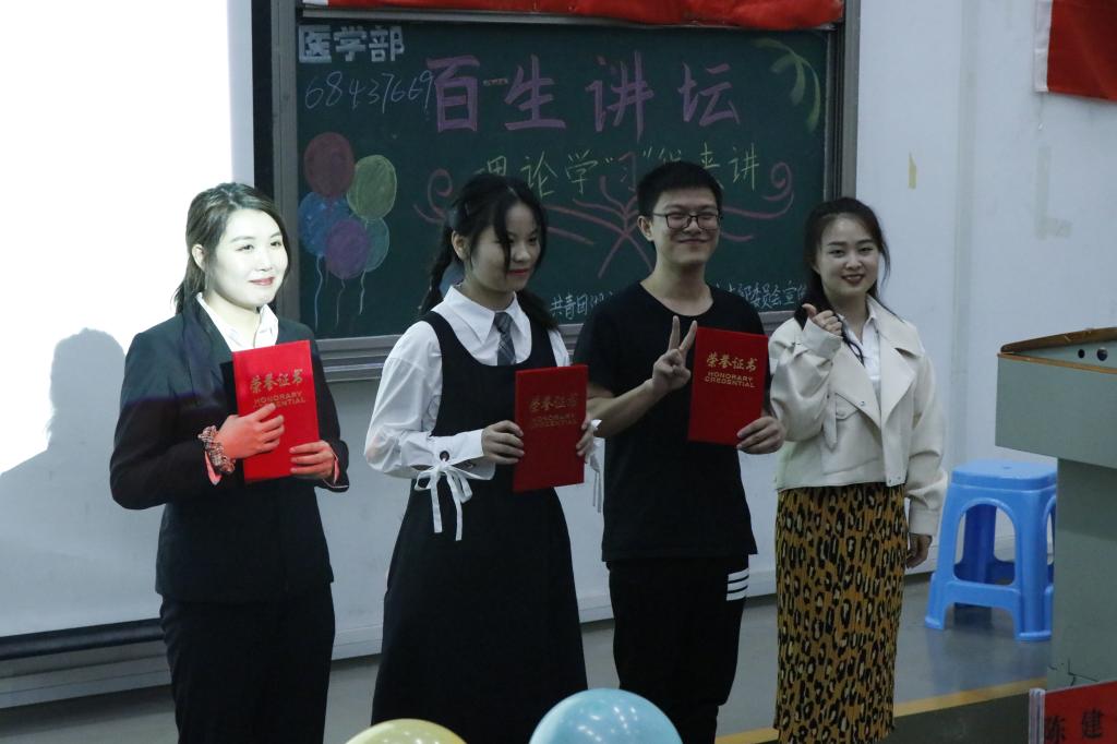 本网讯(记者 李东 刘思 摄影 张可欣 付傲)为深入学习贯彻习近平新时代中国特色社会主义思想,用习近平新时代中国特色社会主义思想武装青年大学生。9月26日晚,由共青团365电子娱乐官方网站医学部总支部委员会宣传部主办的2020年百生讲坛演讲比赛于修远楼5B404报告厅举行。医学部学生工作办公室老师郑娅、袁琳、陈建萍应邀担任评委,现场观众两百余人。