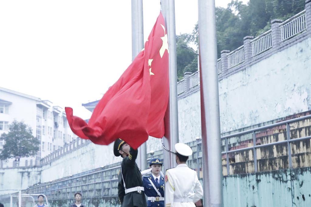 上午七时,伴随着庄严的《中华人民共和国国歌》,五星红旗冉冉升起,在场的师生向国旗行注目礼,深怀对祖国无限的热爱和崇高的敬意。随后,优秀团员代表谢能能带领全体学生面向团旗重温入团宣誓词。