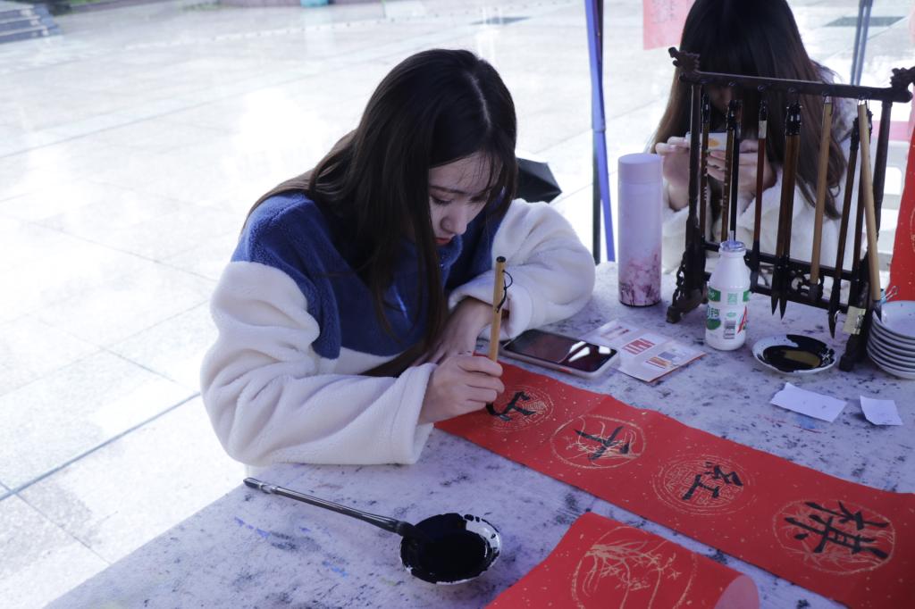 活动现场热闹非凡,处处洋溢着暖暖的温情和喜庆的气氛。墨缘书画社的成员铺纸研墨,挥毫泼墨,一幅幅精美的对联瞬间呈现,字里行间洋溢着我部学子对美好生活的不断追求和热爱。M·EC协会则展出优美的英文书法作品,用英语传递出新春的祝福。本次活动还设有游戏环节,趣味的有奖活动让同学们在交流书画心得的同时也增长了英语知识。