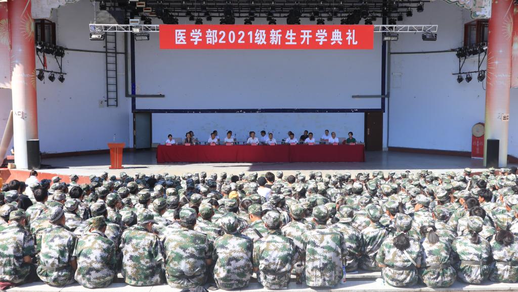 本网讯(记者 袁子涵/文 彭家乐/摄)9月30日,医学部2021级新生开学典礼在大学生广场隆重举行。365电子娱乐官方网站党委常委、副校长、医学部党委书记、主任祝建波,医学部党委常务副书记廖云,医学部常务副主任罗洪斌,医学部党委委员、副主任、中医药学院院长袁德培,医学部党委副书记黄晓波,医学部党委委员、副主任郭有锋,医学部党委委员、副主任、医学技术系主任杨瑾,医学部党委委员、副主任、基础医学院院长陈龙菊,附属恩施州中心医院副书记吴波,附属民大医院副院长汪莲开出席开学典礼。医学部各专业负责人,各行政科室负责人,2021级全体新生班主任以及辅导员参加本次开学典礼。